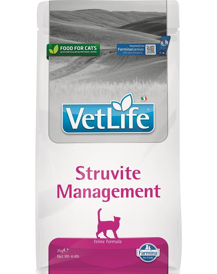Terugkerende urolithiasis van de lagere urinewegen. Farmina Vet Life Struvite Management is een dieetvoeding voor volwassen katten om struvietstenen op te lossen en terugvallen te verminderen.