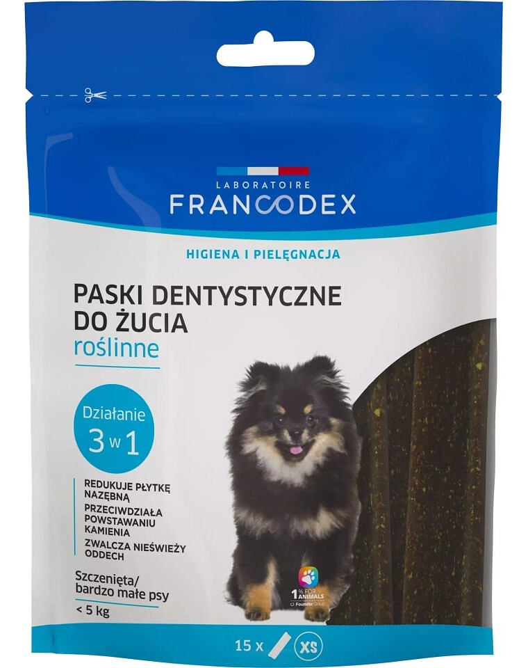 De groenten-kausticks van Laboratoire Francodex voor het verwijderen van tandsteen en geur in de mond zijn speciaal ontwikkeld voor de kleinste hondenrassen. De juiste grootte, de "Z"-vorm en het abrasieve, ruwe oppervlak zorgen voor een effectieve mechanische reiniging van de tanden. Het in de formule aanwezige granaatappelvruchtconcentraat vermindert de vorming van plaque, die verantwoordelijk is voor de onaangename geur. Bovendien remt de combinatie van twee enzymen - glucoseoxidase en lactoperoxidase - de groei van micro-organismen en vermindert zo de vorming van tandsteen. De plantaardige formule vermindert het risico op voedselallergieën.