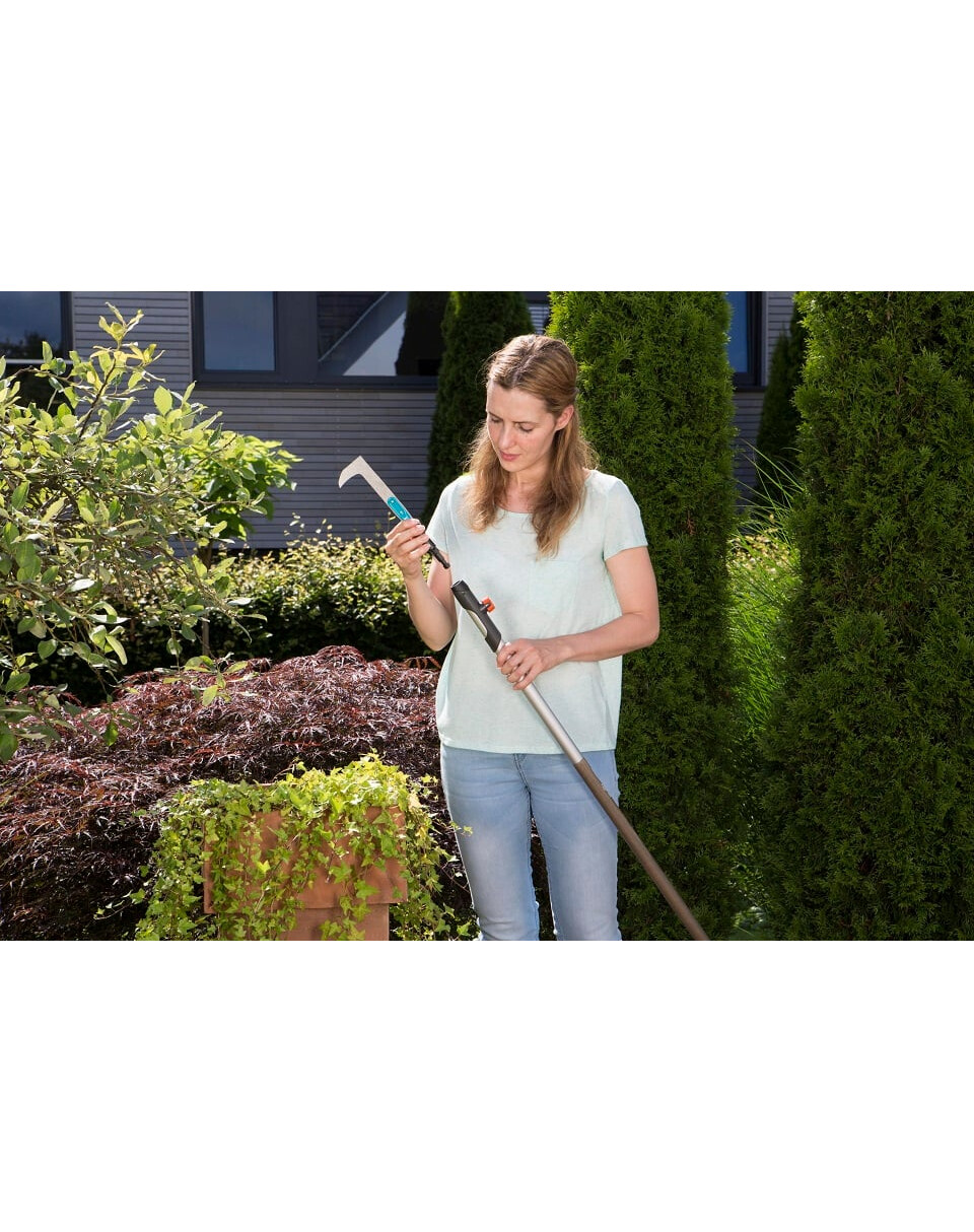 De GARDENA combisystem-voegschraper is bedoeld voor het verwijderen van mos en onkruid tussen bestrating, aan voegen en langs muur randen. Het GARDENA combisystem biedt flexibiliteit in gebruik door verwisselbare gereedschappen. De combischraper is compatibel met alle GARDENA Combisystem-stelen en kan eenvoudig aan de steel worden bevestigd. Om comfortabel en zonder bukken te werken, wordt de steel eenvoudig verwijderd en vervangen door de Combisystem-steel. De Combisystem-verlengsteel is ideaal voor het verlengen van handgereedschappen. De robuuste combinatie van schraper en steel zorgt voor comfortabel werken in elke situatie. De ergonomisch gevormde handgreep met zachte componenten ligt perfect in de hand en voorkomt door zijn rondingen dat het gereedschap wegglijdt. De aan beide zijden geslepen messen van gehard roestvrij staal zijn extreem duurzaam. Ze zorgen voor de beste resultaten bij het verwijderen van mos en onkruid. De voegschraper wordt geleverd met een mesbescherming voor veilige opslag.