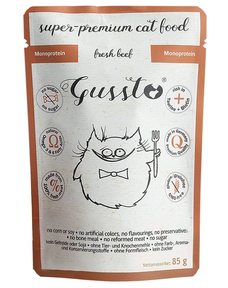 Volwaardig compleet en uitstekend uitgebalanceerd Super Premium kattenvoer. Wordt voor 100 % gemaakt van vers vlees van de hoogste kwaliteit, met inachtneming van de hoogste normen voor voedsel voor mensen. Gusto is de essentie van een goede en gezonde voeding. Bevat zeer veel vlees, ideaal afgestemd op de specifieke voedingsbehoeften van katten. Het is een enkel-eiwitvoer, dus holistisch, gemakkelijk verteerbaar en zeer goed opneembaar, ook aanbevolen voor katten met een gevoelige maag-darmkanaal. Toegepast ook bij eliminatiediëten bij voedselallergieën. Een uitstekend uitgebalanceerde verhouding van calcium/fosfor minimaliseert het risico op urineweg- en nierziekten. Daarnaast bevat het voer Gusto veel noodzakelijke vitaminen en mineralen, is rijk aan taurine en biotine, en zijn bestanddeel is de heilzame distelolie – rijk aan onverzadigde vetzuren, die een ontstekingsremmende werking heeft, de spijsvertering en regeneratiefuncties van de lever regelt, evenals het afweersysteem versterkt.
