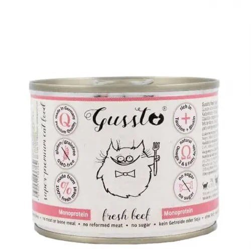 Volwaardig compleet en uitstekend uitgebalanceerd Super Premium kattenvoer. Wordt voor 100 % gemaakt van vers vlees van de hoogste kwaliteit, met inachtneming van de hoogste normen voor voedsel voor mensen. Gusto is de essentie van een goede en gezonde voeding. Bevat zeer veel vlees, ideaal afgestemd op de specifieke voedingsbehoeften van katten. Het is een enkel-eiwitvoer, dus holistisch, licht verteerbaar en zeer goed opneembaar, ook aanbevolen voor katten met een gevoelige maag-darmkanaal. Ook toegepast bij eliminatiediëten bij voedselallergieën. Een uitstekend uitgebalanceerde verhouding van calcium/fosfor minimaliseert het risico op urineweg- en nierziekten. Daarnaast bevat het voer Gussto veel noodzakelijke vitaminen en mineralen, is rijk aan taurine en biotine, en zijn bestanddeel is de heilzame distelolie – rijk aan onverzadigde vetzuren, die een ontstekingsremmende werking heeft, de spijsvertering en regeneratiefuncties van de lever regelt, evenals het afweersysteem versterkt.