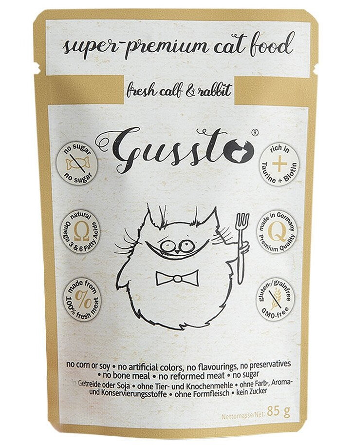 Volwaardig compleet en uitstekend uitgebalanceerd Super Premium kattenvoer. Wordt voor 100 % uit vlees van de hoogste kwaliteit geproduceerd, met inachtneming van de hoogste normen voor voedsel voor mensen. Gussto is de essentie van een goede en gezonde voeding. Bevat zeer veel vlees, ideaal afgestemd op de specifieke voedingsbehoeften van katten. Het is een enkel-eiwitvoer, dus holistisch, licht verteerbaar en zeer goed opneembaar, ook aanbevolen voor katten met een gevoelige spijsvertering. Ook toegepast bij eliminatiediëten bij voedselallergieën. Een uitstekend uitgebalanceerde verhouding van calcium/fosfor minimaliseert het risico op urineweg- en nierziekten. Daarnaast bevat het voer Gussto veel noodzakelijke vitaminen en mineralen, is rijk aan taurine en biotine, en zijn bestanddeel is de heilzame distelolie – rijk aan onverzadigde vetzuren, die ontstekingsremmende werking heeft, de spijsvertering en regeneratiefuncties van de lever regelt, evenals het immuunsysteem versterkt.