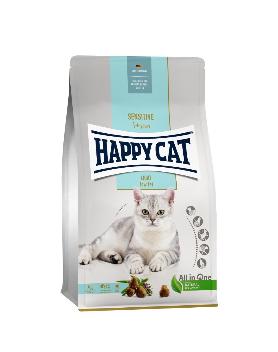 De smakelijke formule van Happy Cat Sensitive Light met waardevolle rozemarijn en mariadistel is ontwikkeld voor katten die geneigd zijn tot overgewicht en ter behoud van de lichaamsconstitutie. Het verzadigende en vezelrijke voer bevat slechts 9 % vet. De samenstelling van licht verteerbaar gevogelte en fijne kruiden zorgt dankzij de drie verschillende kroketvormen voor meer plezier en variatie in de voerbak. Op basis van ons Happy Cat Natural Life Concept® hebben onze voedingsdeskundigen een speciale vitaliteitsformule ontwikkeld die op natuurlijke wijze de vijf belangrijkste behoeften van een kat dekt. Voedingsfysiologisch bevestigd zorgt het voor een gereguleerde spijsvertering, versterkt het immuunsysteem, ondersteunt het urinewegstelsel, bevordert de hartgezondheid en is goed voor huid & vacht.