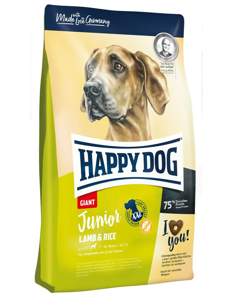 Happy Dog Junior Giant Lamb & Rice: Ab dem 7. Monat sollte das Futter einen moderaten Energie- und Proteingehalt haben, um zu schnelles Wachstum zu vermeiden. Happy Dog Junior Giant Lamb & Rice hat perfekt angepasste Energie- und Proteingehalte für Junghunde sehr großer Rassen. Die schmackhafte, geflügelfreie Rezeptur aus Lamm, hochverdaulichem Reis und der wertvollen Neuseeland-Muschel ist auch für sensible Junghunde geeignet. Die einzigartige Herzform mit Loop macht die Krokette aufgrund der großen Oberfläche leichter verdaulich. Das Happy Dog Natural Life Concept® versorgt den Hund mit allem, wovon sein Organismus ganzheitlich profitiert. Ab dem 18. Monat sollte langsam auf ein Happy Dog Adult-Produkt, zum Beispiel "Neuseeland", umgestellt werden. Hergestellt in Deutschland unter strengster Qualitätskontrolle.