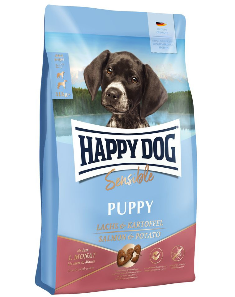 Voedzame zalm en goed verteerbare aardappel voorzien jouw puppy optimaal in de groeizame maanden. Happy Dog Sensible Puppy is ook, dankzij de glutenvrije receptuur, zeer goed geschikt voor gevoelige honden. De uitgebalanceerde receptuur met waardevolle Nieuw-Zeelandse mossel, vitamine C en essentiële vetzuren ondersteunt een harmonieuze groei. Op basis van het Happy Dog Natural Life Concept® wordt jouw lieveling van alles voorzien waar zijn organisme in zijn geheel van profiteert, zodat hij onbezorgd kan beginnen aan een lang hondenleven. Vanaf de 7e levensmaand moet je jouw puppy langzaam overstappen op Happy Dog Sensible Junior met zalm & aardappel. Tijdens de jonge hondenfase groeit jouw kleine lieveling langzamer en heeft daarom een minder voedzame voeding nodig.