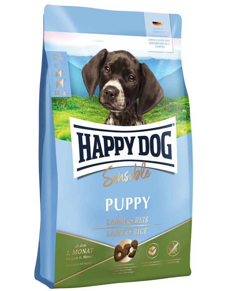 Happy Dog Sensible Puppy met goed verdraagzaam Lam en licht verteerbare Rijst is ideaal afgestemd op de behoeften van puppy's vanaf de 1e maand. Dankzij de gevogeltevrije formule is Sensible Puppy ook zeer goed geschikt voor gevoelige honden. Een uitgebalanceerde voeding met waardevolle Nieuw-Zeelandse schelp en Vitamine C ondersteunt een optimale ontwikkeling. Gebaseerd op het Happy Dog Natural Life Concept® wordt jouw lieveling van alles voorzien waar zijn organisme in zijn geheel van profiteert en hij onbezorgd aan een lang hondenleven kan beginnen. Vanaf de 7e levensmaand moet je jouw puppy langzaam overstappen op Happy Dog Sensible Junior met Lam & Rijst. Tijdens de jonge hondenfase groeit jouw kleine lieveling langzamer en heeft daarom minder voedzame voeding nodig.