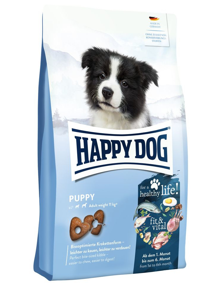 Happy Dog fit & vital Puppy is ideaal afgestemd op de behoeften van puppy's vanaf de 1e levensmaand. De lekkere en volwaardige vitale voeding is gebaseerd op het unieke Happy Dog Natural Life Concept® en ondersteunt een harmonieuze groei tot de zesde levensmaand. Zodat je puppy onbezorgd kan beginnen aan een lang, gelukkig hondenleven, bevat de tarwevrije receptuur bovendien waardevolle essentiële vetzuren en vitamine C ter ondersteuning van het immuunsysteem. Vanaf de 7e levensmaand moet je je puppy geleidelijk overschakelen naar Happy Dog fit & vital Junior met aangepaste energie-inhoud om overvoeding te voorkomen. Tijdens de jongedierenfase groeit je kleine lieveling langzamer en heeft daarom minder voedzame voeding nodig.