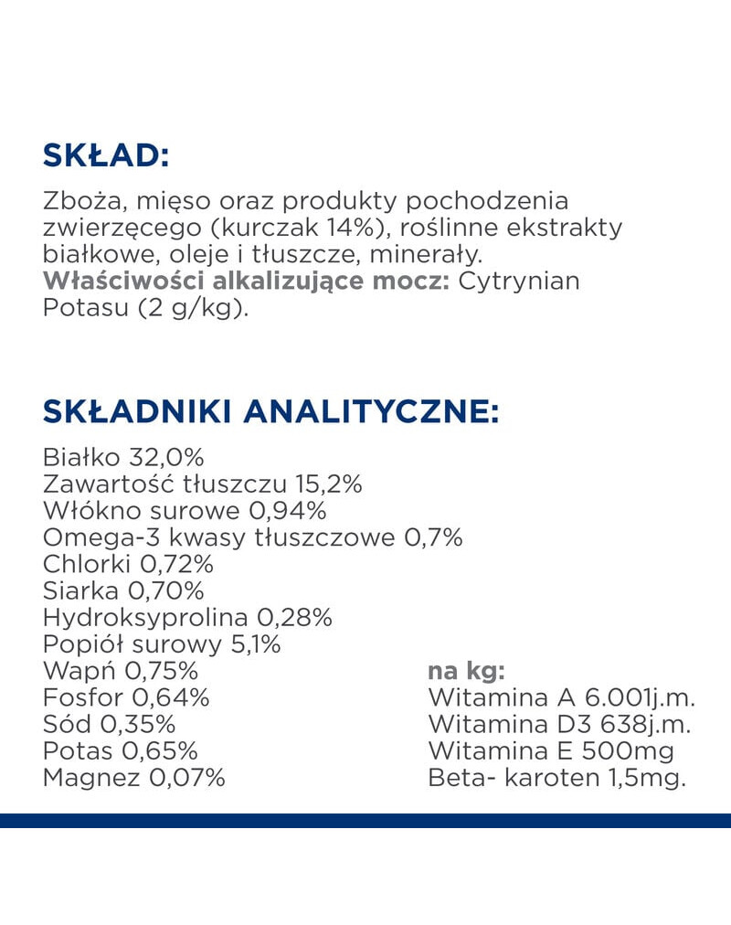 : Granen, vlees en dierlijke bijproducten (Kip 14%), plantaardige eiwitextracten, oliën en vetten, mineralen. Alkaliserende middelen voor de urinewegen: Kaliumcitraat (2 g/kg).