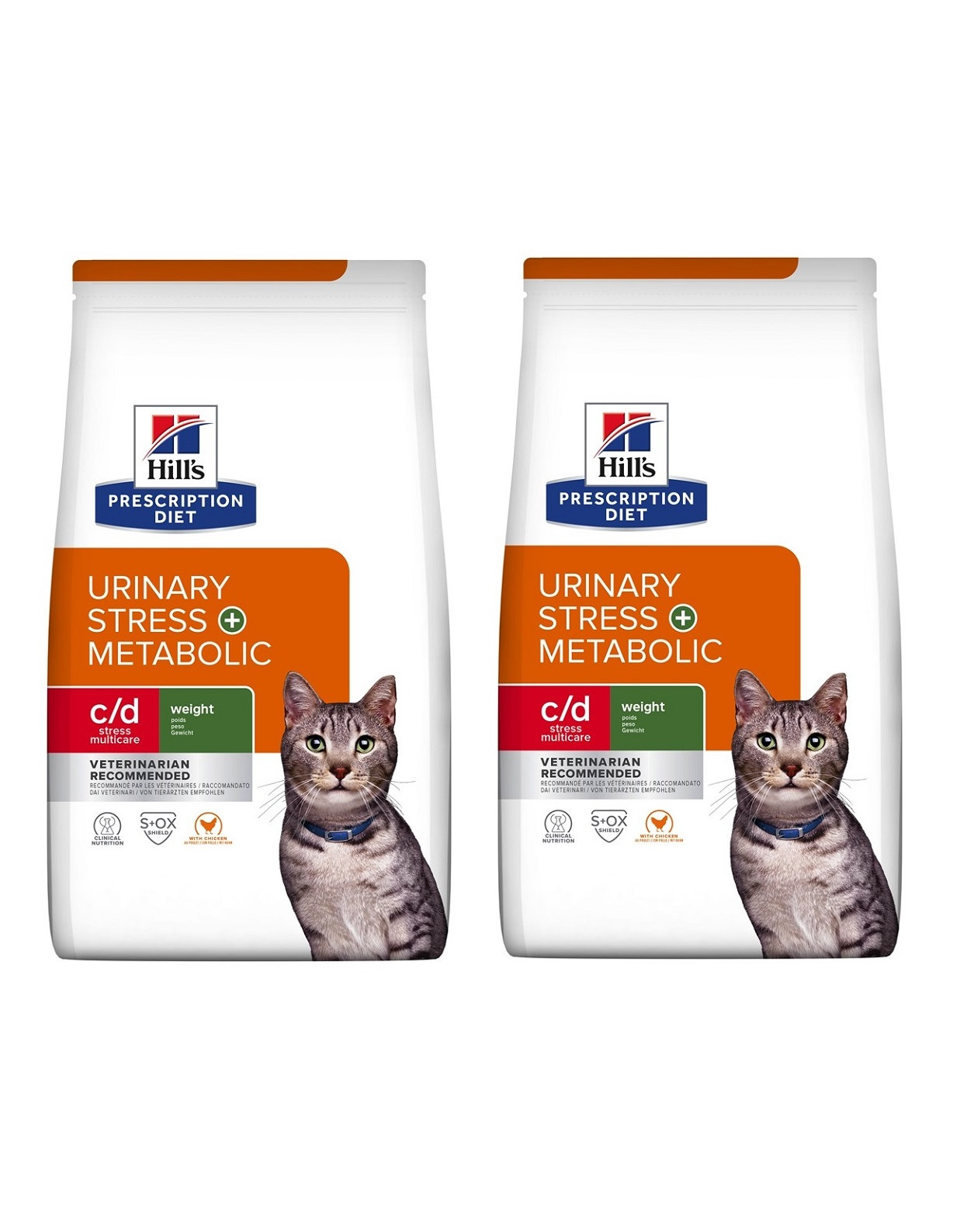 Hill's PRESCRIPTION DIET c/d Multicare Stress + Metabolic kattenvoer met kip is een dieetvoeding voor de oplossing van struvietstenen, ter vermindering van struvietsteenrecidieven (oorzaak van aandoeningen van de lagere urinewegen bij katten, FLUTD), ter vermindering van oxalaatvorming en ter vermindering van overgewicht bij volwassen katten. Dit voer heeft een laag energiegehalte, urine-onderverzadigende eigenschappen met betrekking tot struviet, urine-alkaliserende eigenschappen en een laag gehalte aan magnesium, calcium en vitamine D.