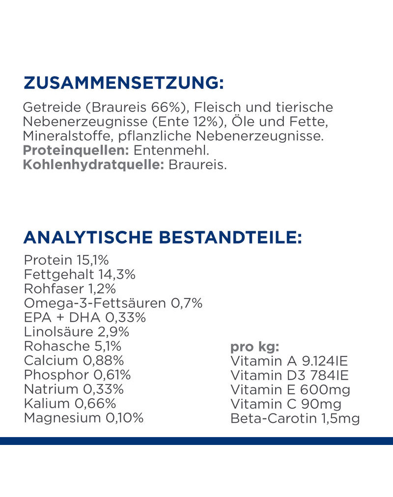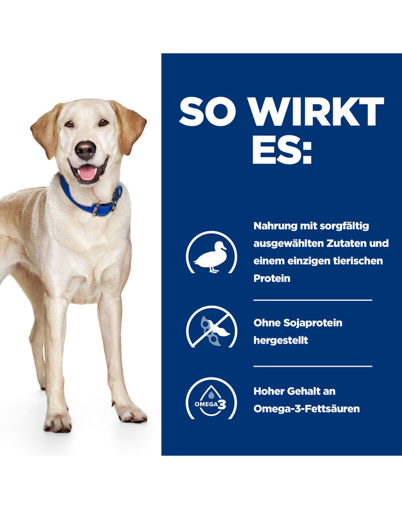 Hill's PRESCRIPTION DIET hondenvoer d/d met eend en rijst is een dieetvoeding voor volwassen honden ter ondersteuning van de verlichting van symptomen van voedsel- en voedingscomponentenintolerantie en huidgezondheid bij huidaandoeningen en overmatig haarverlies. Dit voer heeft een hoog gehalte aan linolzuur (LA) en een gecombineerde hoeveelheid eicosapentaeenzuur (EPA) en docosahexaeenzuur (DHA) evenals geselecteerde en beperkte bronnen van eiwitten en koolhydraten.