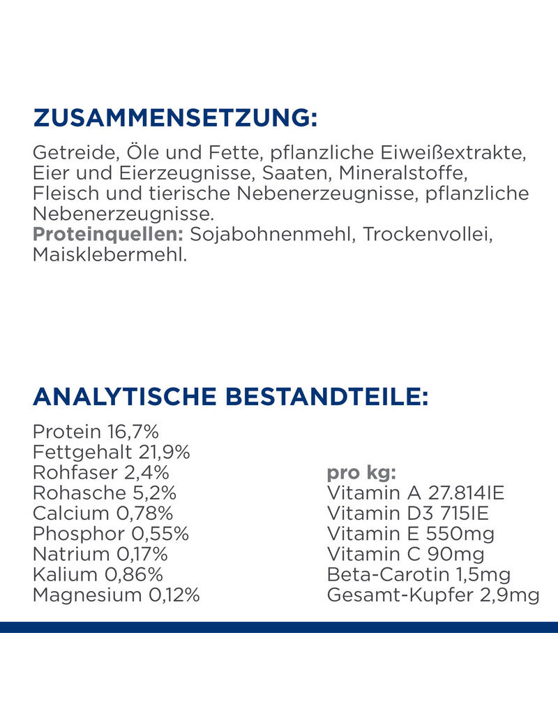 INGREDIËNTEN: Brouwersrijst, Kip, Kippenvet, Eiproduct, Sojaboonmeel, Lijnzaad, Cellulosepoeder, Kipleveraroma, Dicalciumfosfaat, Melkzuur, Sojaboonolie, Kaliumchloride, Bietendroogsnippers, Glycerinmonostearaat, Calciumcarbonaat, DL-Methionine, Vitaminen (Vitamine E-toevoeging, L-Ascorbyl-2-Polyfosfaat (Bron van Vitamine C), Niacine-toevoeging, Thiaminemononitraat, Vitamine A-toevoeging, Calciumpantothenaat, Pyridoxinehydrochloride, Biotine, Vitamine B12-aanvulling, Riboflavine-aanvulling, Foliumzuur, Vitamine D3-aanvulling, Menadion-natriumbisulfit-complex (Bron van Vitamine K)), Visolie, Cholinechloride, Gejodeerd zout, L-Lysine, L-Arginine, Taurine, Mineralen (Zinkoxide, Mangaanoxide, Calciumjodaat, Natriumseleniet), L-Tryptofaan, L-Carnitine, gemengde tocopherolen voor versheid, natuurlijke aroma's, Beta-Caroteen.