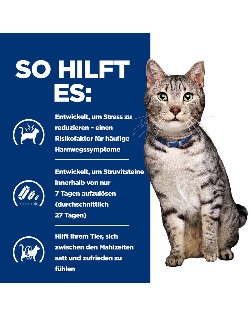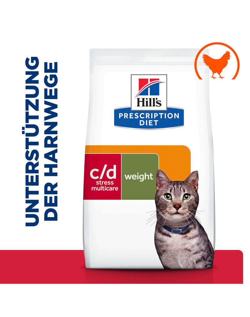 Hill's Prescription Diet Feline c/d Urinary Care Multicare Stress + Metabolic is een droogvoer voor katten met urinewegproblemen/ziekten die veroorzaakt worden door overgewicht. Bij een overgewichtige kat bestaat het risico dat ze op lange termijn urinewegproblemen zoals bijvoorbeeld urinestenen ontwikkelt. Stress heeft ook invloed op de gezondheid van de kat en is een risicofactor voor de ontwikkeling van urinewegproblemen en -ziekten. Daarom bevat Urinary Care Multicare Stress ingrediënten die uw kat kunnen helpen om stress te beheersen.