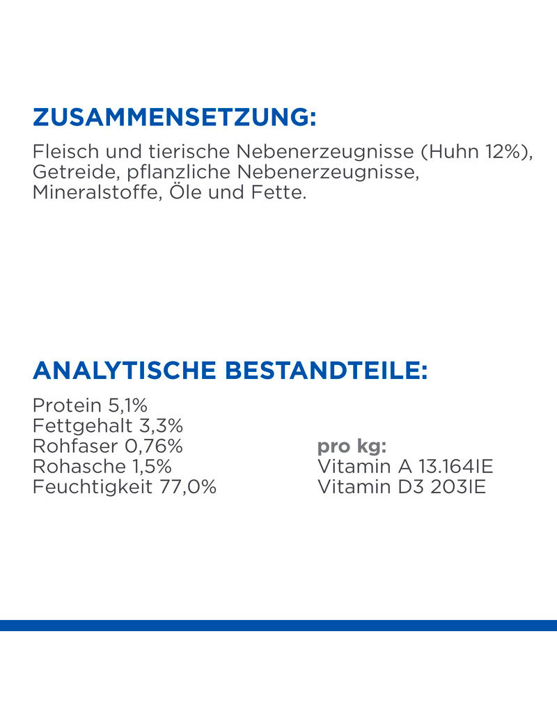 ANALYSE: Vet 2,2 %, Eiwit 5 %, Calcium 0,16 %, Koolhydraten (NFE) 14,5 %, Vezels (ruw) 2,7 %, Magnesium 0,03 %, Vocht 74,3 %, Omega-3-vetzuren 0.09 %, Omega-6-vetzuren 0,95 %, Fosfor 0,12 %, Kalium 0,17 %, Natrium 0,08 %, Vitamine A 4050 IU/kg, Vitamine D 300 IU/kg, Vitamine E 55 mg/kg
