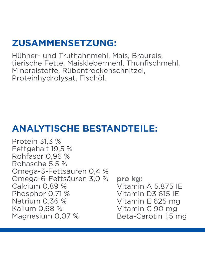 SAMENSTELLING: Kip- en kalkoemeel, maïs, brouwrijst, dierlijke vetten, maïsglutenmeel, tonijnmeel, mineralen, bietenpulp, eiwithydrolysaat, visolie.