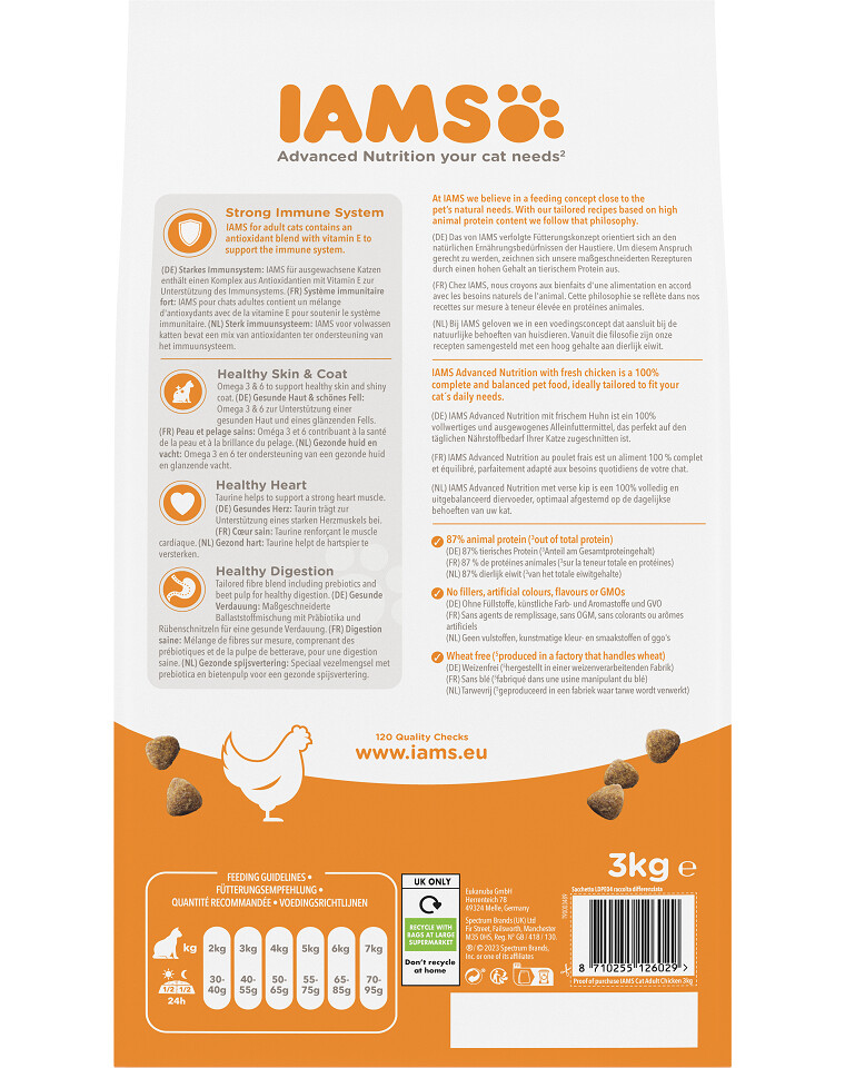Analyse van de samenstelling van IAMS voor Vitaliteit voer voor volwassen katten met verse kip