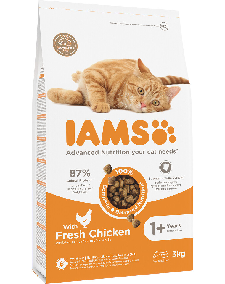 IAMS voor Vitaliteit voor volwassen katten met verse kip is een 100% complete en uitgebalanceerde voeding. De nieuwe, smakelijke en verbeterde formule bevat tot 87% dierlijke eiwitten (van de totale eiwitinhoud) en alle ingrediënten die een volwassen kat nodig heeft voor een gezond en actief leven. Het smakelijke voer bevat geen onnodige toevoegingen, geen kunstmatige kleur- of smaakstoffen en geen GGO's. Bovendien is het nieuwe recept gluten vrij*.