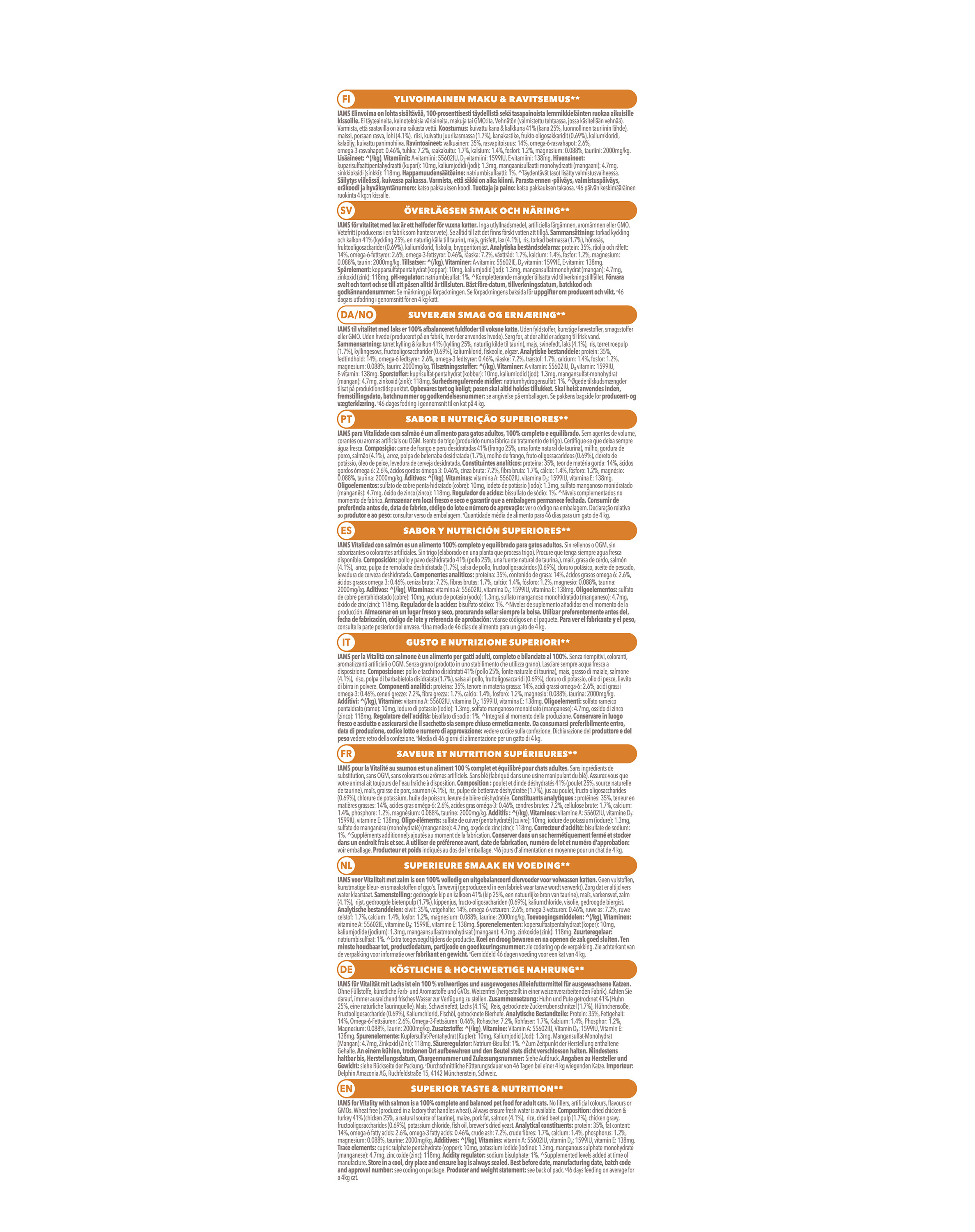gedroogde kip en kalkoen 41% (kip 25%, natuurlijke taurinebron), maïs, varkensvet, zalm (4,1%), rijst, gedroogde bietensnippers (1,7%), kippenbouillon, fructo-oligosacchariden (0,69%), kaliumchloride, visolie, gedroogde biergist