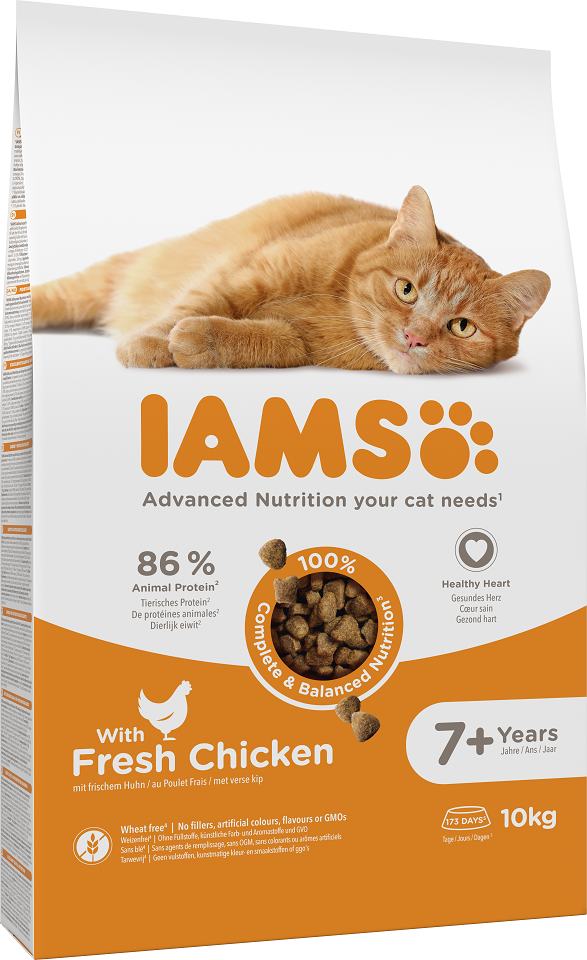 IAMS for Vitality is een 100 % volwaardig en evenwichtig speciaalvoer voor oudere katten, dat uw viervoeter niet alleen uitstekend smaakt, maar hem ook optimaal laat gedijen. Onze nieuwe en verbeterde formule met vers kip voor oudere katten smaakt bijzonder lekker en is gebaseerd op hoogwaardige dierlijke eiwitten, die zorgvuldig zijn geselecteerd en die de 7 tekenen van gezonde vitaliteit van uw viervoeter bevorderen. We zijn er vast van overtuigd dat katten van nature gezonde en actieve dieren zijn, die vol vitaliteit zitten. Om deze reden bevat onze smakelijke formule 88 % dierlijk eiwit (aandeel in de totale eiwitinhoud).