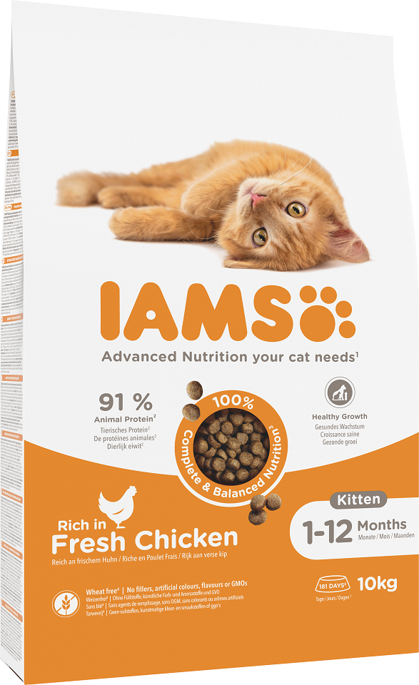 IAMS for Vitality voor Kittens met verse Kip is een 100% complete en uitgebalanceerde voeding. De nieuwe, smakelijke en verbeterde formule bevat tot 91% dierlijke eiwitten (van de totale eiwitinhoud) en alle ingrediënten die nodig zijn voor een groeiende en zich ontwikkelende kitten. Het heerlijke voer bevat geen onnodige toevoegingen, geen kunstmatige kleur- of smaakstoffen en geen GGO's. Bovendien is de nieuwe formule tarwevrij*.