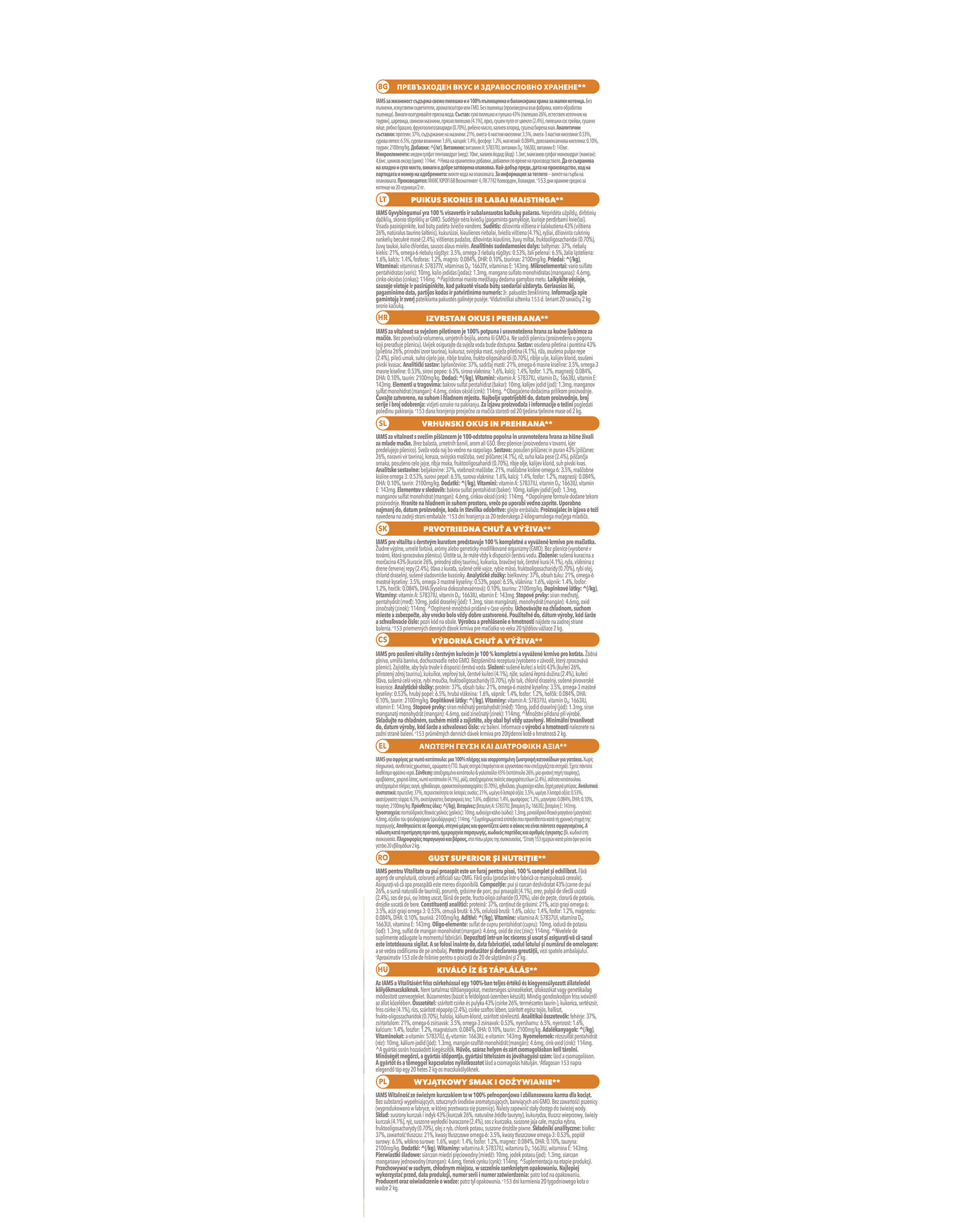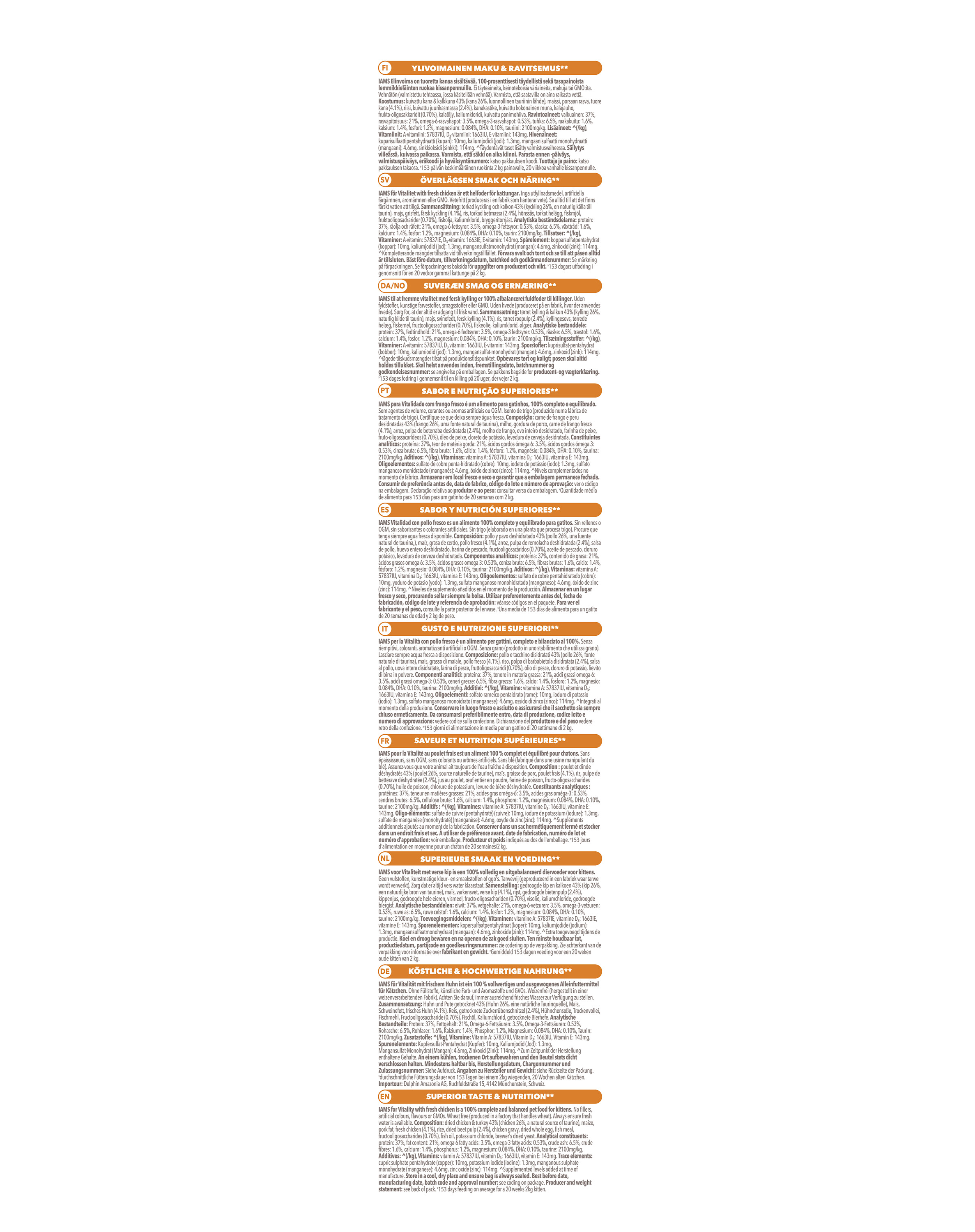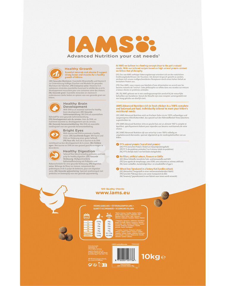 Analyse van de samenstelling van IAMS voor Vitality voer voor Kittens met verse Kip
