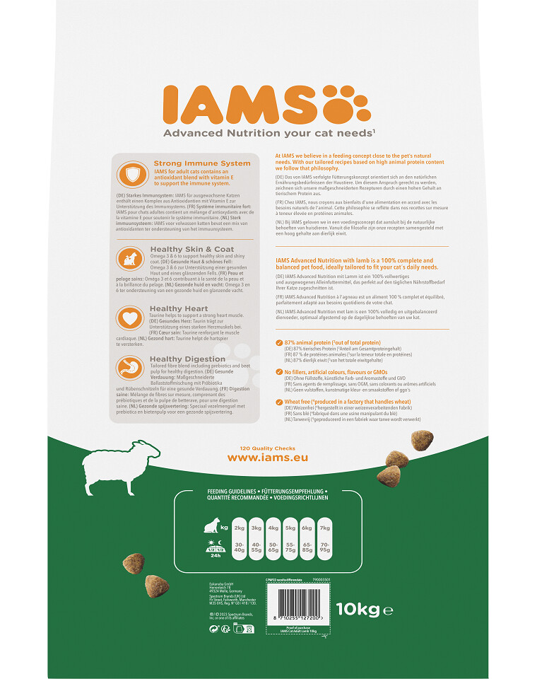 IAMS for Vitality ist reich an tierischem Eiweiß und bietet eine 100 % vollständige und ausgewogene Ernährung. Lammfleisch hat einen hohen Nährwert und ist ein leicht verdauliches Eiweiß, das den Körper mit allen essenziellen Aminosäuren versorgt. Das im Futter enthaltene Huhn ist eine Quelle von B-Vitaminen (Niacin, Riboflavin), die besonders wichtig für das Nervensystem der Katze sind. IAMS for Vitality ist reich an essentiellen Fettsäuren, die für das reibungslose Funktionieren des Herz-Kreislauf-Systems verantwortlich sind.