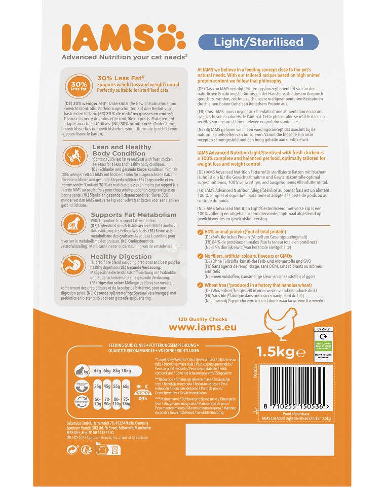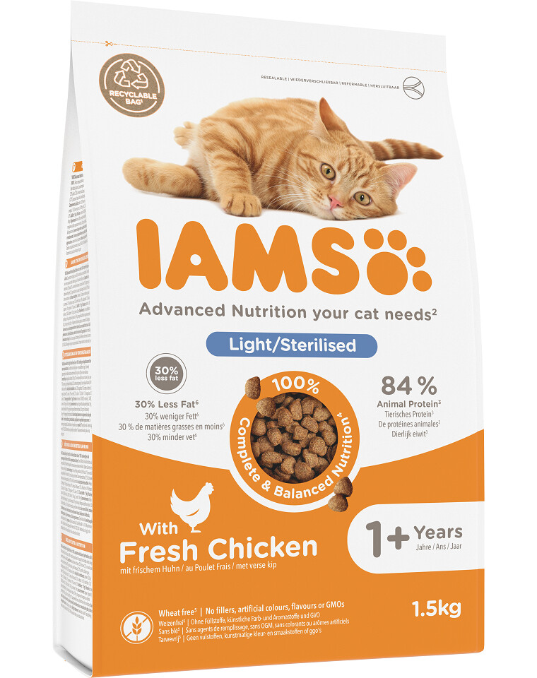 Het voer heeft een zeer verlaagd vetgehalte. Het is afgestemd op de lagere energiebehoefte van katten. Dierlijke eiwitten zijn essentieel voor het goed functioneren van het kattenlichaam. Een voldoende gehalte aan vitamines en mineralen, evenals een hoge smakelijkheid, zijn de voordelen van dit voer.