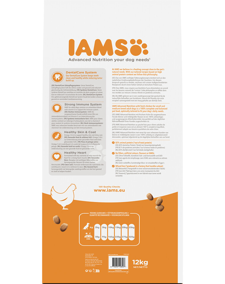 Het voer is tarwevrij en is gebaseerd op gedroogde kip en kalkoen. Het is een uitgebalanceerd en smakelijk voer en bevat 82% dierlijke eiwitten. De grootte van de brokjes is aangepast aan de kaken van kleine en middelgrote honden. Essentiële mineralen en vitamine D ondersteunen de botten van uw hond, terwijl een geschikte mix van antioxidanten met de vitamines C en E het immuunsysteem ondersteunt.