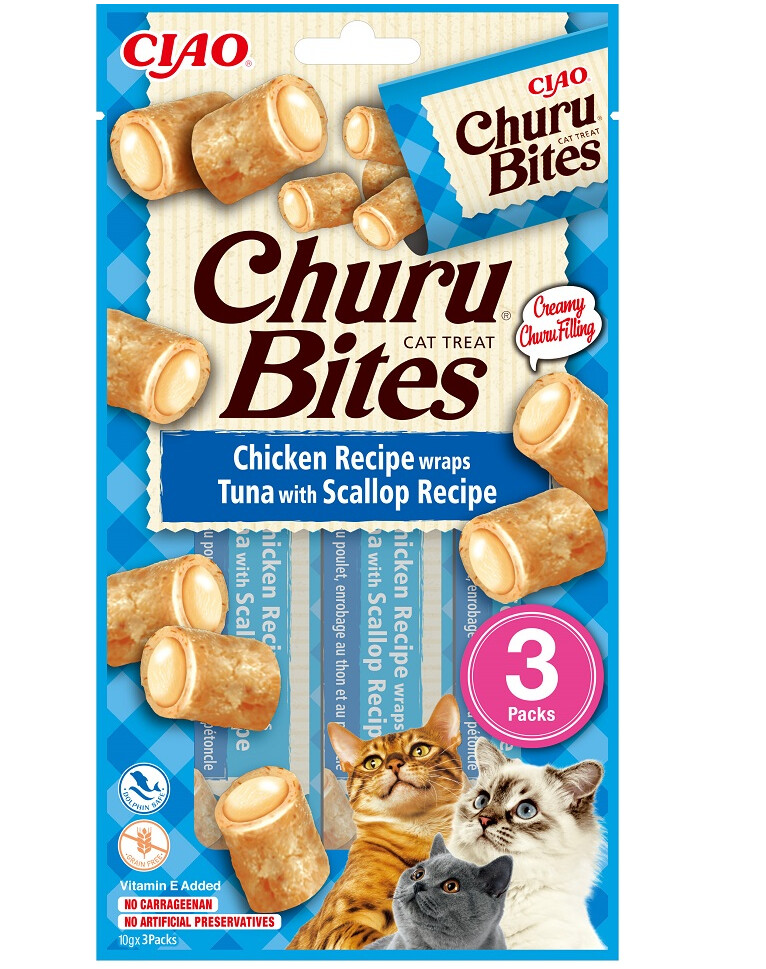 Churu Bites zijn kussenvormige stukjes met mals, gebakken kippenvlees aan de buitenkant en romige Churu-vulling aan de binnenkant. Twee verschillende texturen in één heerlijke hap.