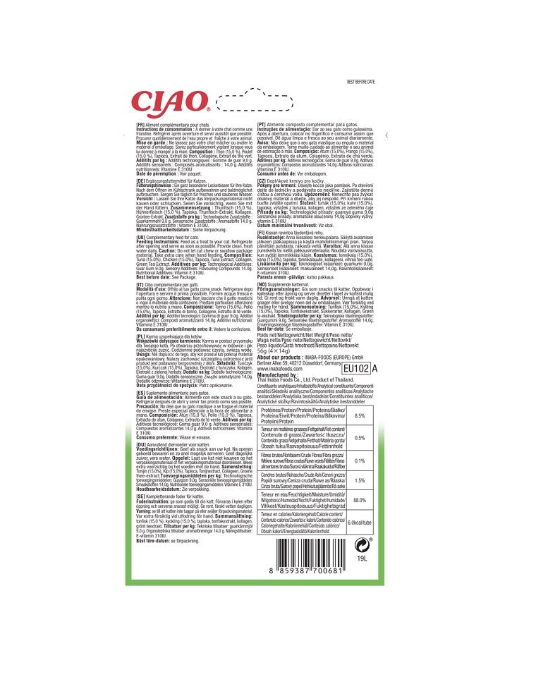 Tonijn (15,0%), Kip (15,0%), Tapioca, tonijn-extract, collageen, groene thee-extract