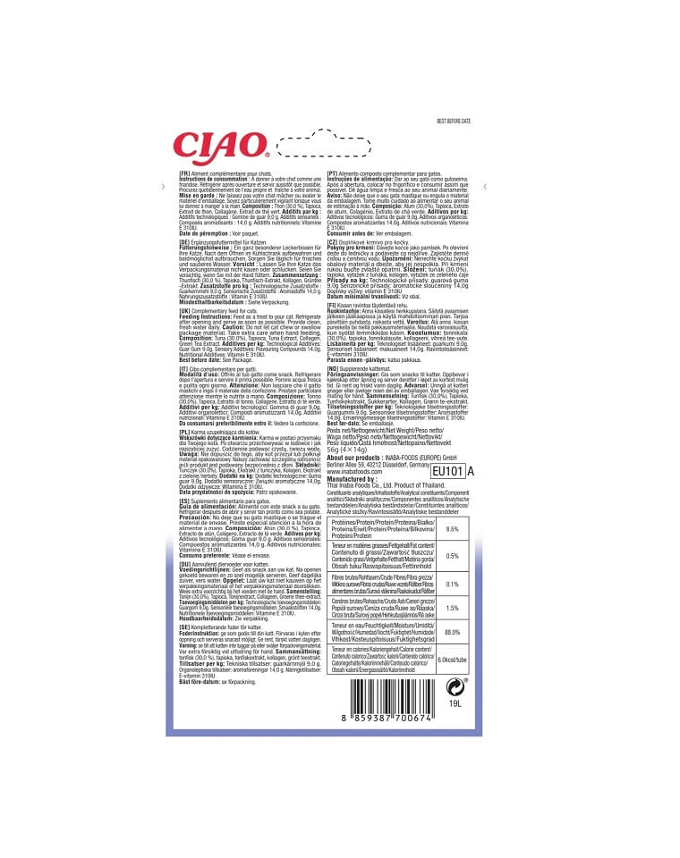 Tonijn 30%, Tapioca, natuurlijke tonijn-extract, collageen, groene thee-extract