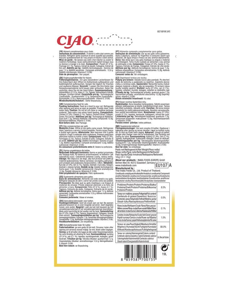 Kip (27,9%), kaas (2,1%), tapioca, kippenextract, collageen, groene thee-extract