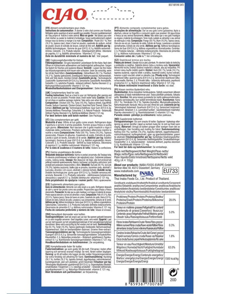 Gemaakt van 100% puur en natuurlijk kippenvlees van vrije uitloop en wilde tonijn. Elke verpakking bevat vier afzonderlijke zakjes met lekkernijen om maximale versheid te garanderen. De verpakking is zo ontworpen dat u uw kat uit de hand kunt voeren, wat uw band nog hechter maakt.