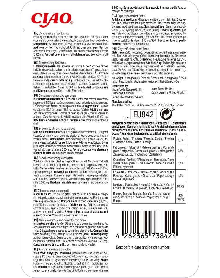 Voedingsadvies: Aanvullend voer in de vorm van een traktatie voor uw kat. Dit product moet alleen aanvullend op ander voer of tussen de maaltijden worden gegeven. Zorg ervoor dat uw kat altijd toegang heeft tot een schaal met vers water. Bewaar het product op een droge en koele plaats, uit de buurt van direct zonlicht. Na opening in de koelkast bewaren en zo snel mogelijk verbruiken.