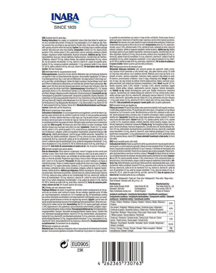 Ingrediënten: Kip (33,1%), Tapioca (gedroogd), Pompoen (1,8%), Kippenextract (1,6%), Gistextract, Calciumcarbonaat, Kaliumchloride, Collageen, Magnesiumsulfaat-heptahydraat, Dicalciumfosfaat. Additieven per 1 kg: Technologische additieven: Guarkernmeel. Sensorische additieven: Paprika-oleoresine, Camellia thea Link. Dieetadditieven: Vitamine E 574 mg, Cholinechloride, Zinksulfaat-monohydraat 26,0 mg, Vitamine B2, IJzer(II)-sulfaat-monohydraat 10,4 mg, Vitamine A, Vitamine B1, Koper(II)-sulfaat-pentahydraat 2,0 mg, Mangansulfaat-monohydraat 1,3 mg, Kaliumjodide 0,5 mg, Vitamine D3 182 IU, Natriumseleniet 0,04 mg, Foliumzuur, Vitamine B12.