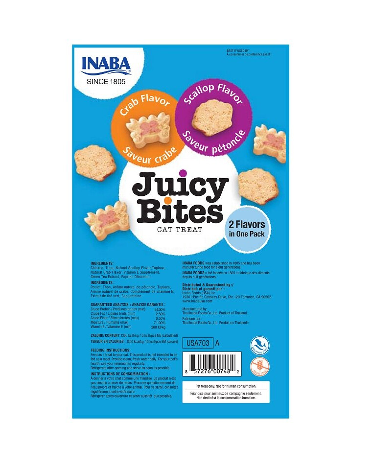 Kippenvlees (94,9 %), Tonijn, Sint-jakobsschelp-extract (1,5 %), Tapioca (gedroogd), Groene thee-extract. Kippenvlees (98,2 %), Tonijn, Krab-extract (0,5 %), Tapioca (gedroogd), Groene thee-extract.