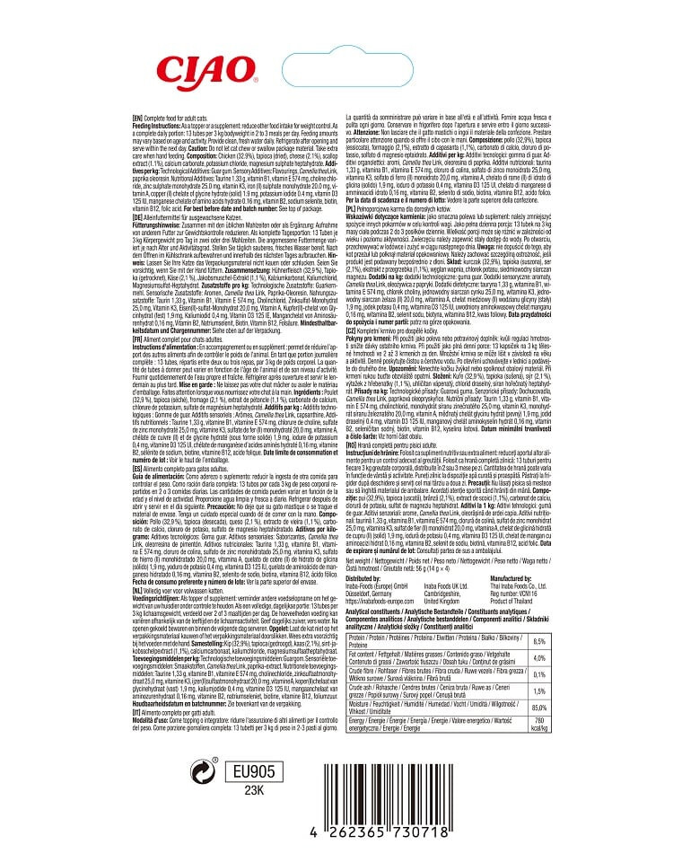 Voedingsadvies: als smakelijke topping of toevoeging aan het voer: verminder de inname van andere voedingsmiddelen voor gewichtscontrole. Als volledige dagelijkse portie: 13 tubes per 3 kg lichaamsgewicht bij 2 tot 3 maaltijden per dag. De portiegrootte kan variëren afhankelijk van leeftijd en activiteitsniveau. Zorg ervoor dat het dier te allen tijde toegang heeft tot water. Bewaar na opening in de koelkast en consumeer binnen de volgende dag.