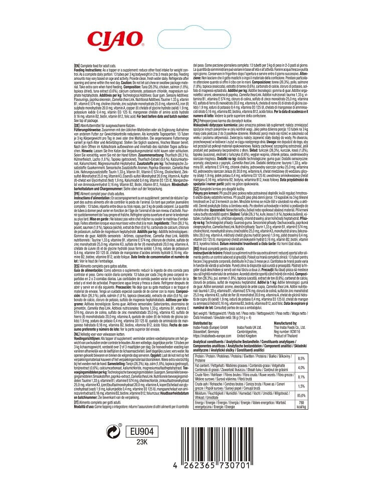 Ingrediënten: tonijn (26,3%), kip, zalm (1,8%), tapioca (gedroogd), tonijnextract (0,6%), calciumcarbonaat, kaliumchloride, magnesiumsulfaat-heptahydraat. Additieven per 1 kg: Technologische additieven: guarkernmeel. Sensorische additieven: aroma's, paprika-oleoresin, Camellia thea Link. Dieetadditieven: taurine 1,33 g, vitamine B1, vitamine E 574 mg, cholinechloride, zinksulfaat-monohydraat 25,0 mg, vitamine K3, ijzer(II)-sulfaat-monohydraat 20,0 mg, vitamine A, koper(II)-chelaat van glycinhydraat (vast) 1,9 mg, kaliumjodide 0,4 mg, vitamine D3 125 IU, mangaan-aminozuurchelaat-hydraat 0,16 mg, vitamine B2, biotine, vitamine B12, foliumzuur.