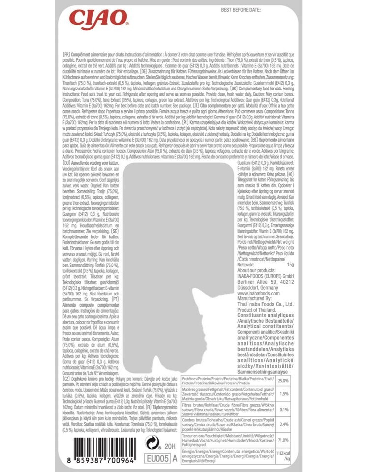 INGREDIËNTEN: Tonijn (88,2%), Tonijnextract (0,7%), Tapioca, Collageen, Groene thee-extract