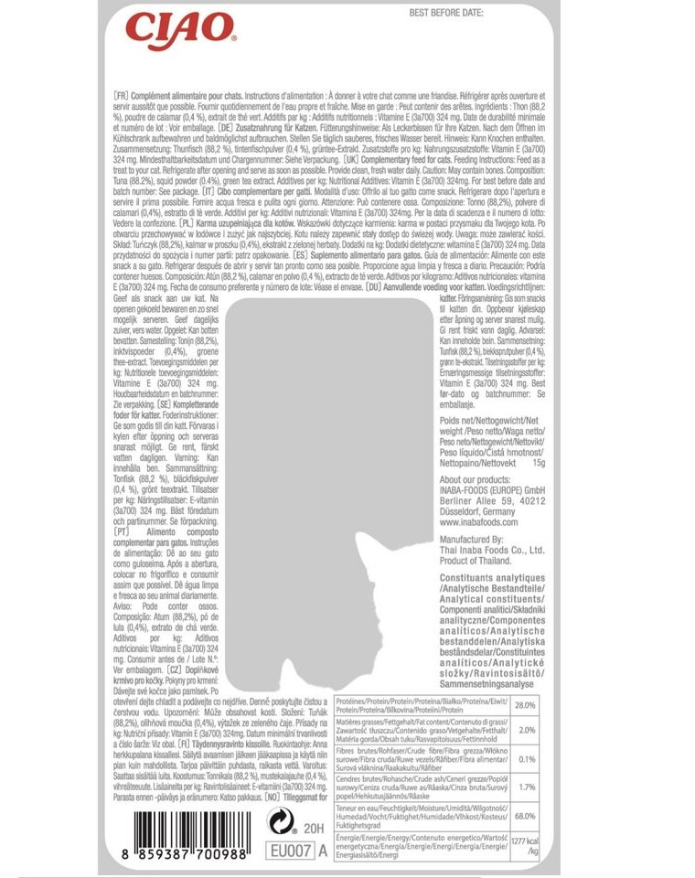INGREDIËNTEN: Tonijn (88,2%), Inktvispoeder (0,4%), Groene thee-extract