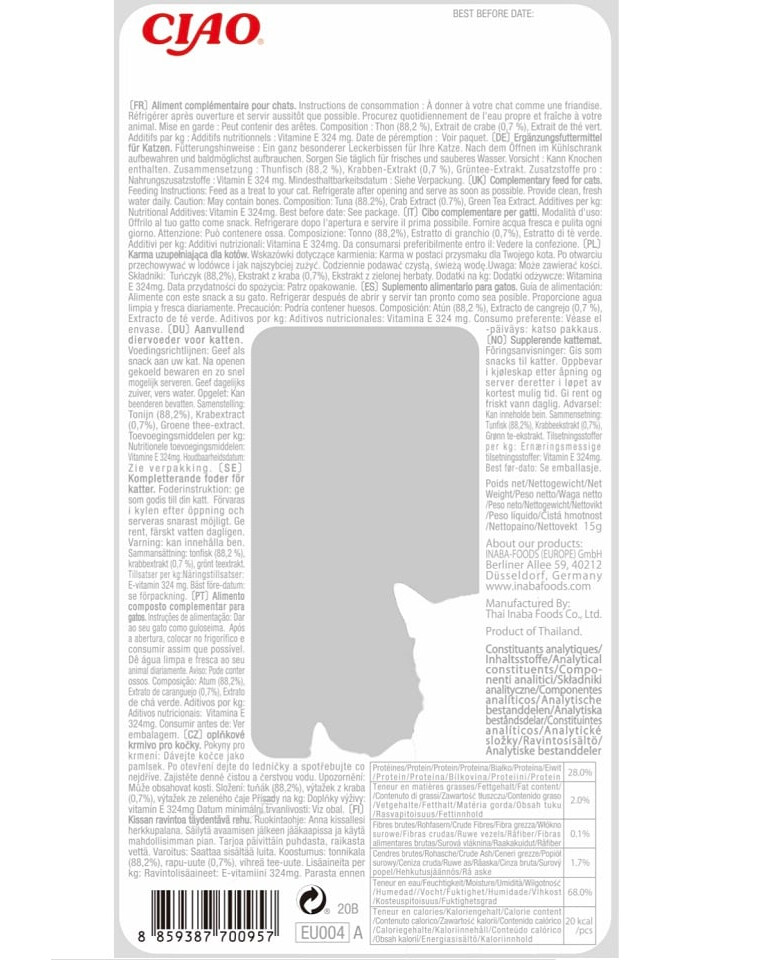 INGREDIËNTEN: Tonijn (88,2%), Krab-extract (0,7%), Groene thee-extract
