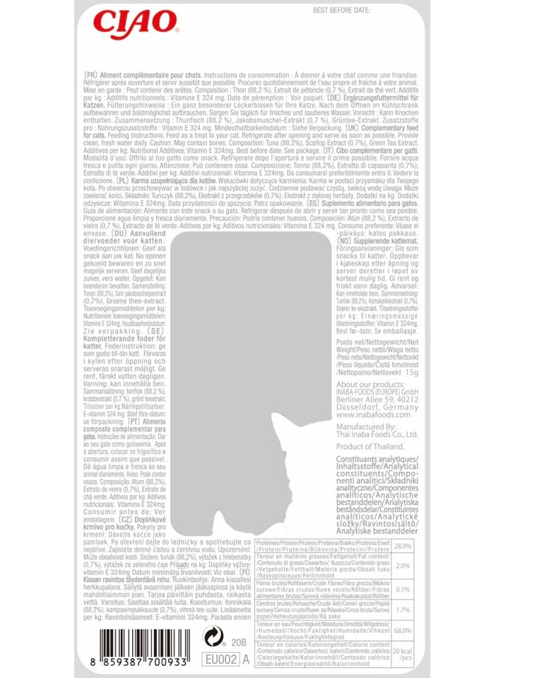 INGREDIËNTEN: Tonijn (88,2%), Sint-jakobsschelpen-extract (0,7%), Groene thee-extract