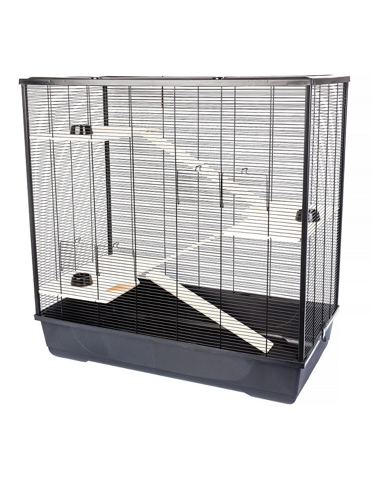 Een hoge, etagekooi voor knaagdieren. De verdiepingen zijn van hout, met houten ladders die naar elke verdieping leiden, volledig veilig voor de dieren. De kooi kan van bovenaf worden geopend en is bovendien met drukknoppen gesloten, zodat de veiligheid gewaarborgd is en het dier tegelijkertijd gemakkelijk kan worden verwijderd. De breedte tussen de draden is aangepast aan de knaagdieren en voorkomt een mogelijke ontsnapping. De diepe kattenbak maakt spelen, graven en het aanleggen van tunnels in het zaagsel mogelijk, zonder dat dit in de kooi wordt gemorst.