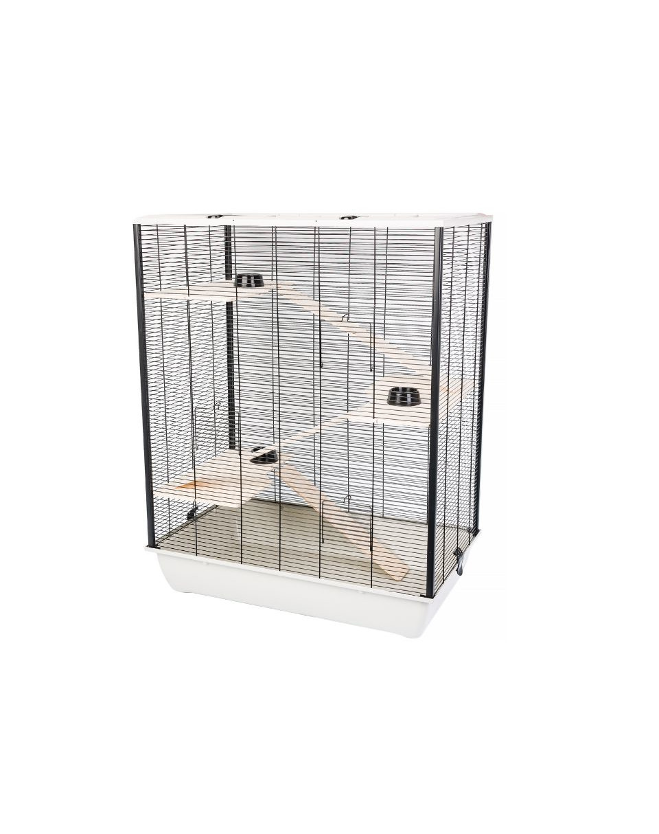De kattenbak van kunststof voorkomt het morsen van afval en maakt een snelle en eenvoudige reiniging mogelijk. De kooi heeft een volledig open dak.