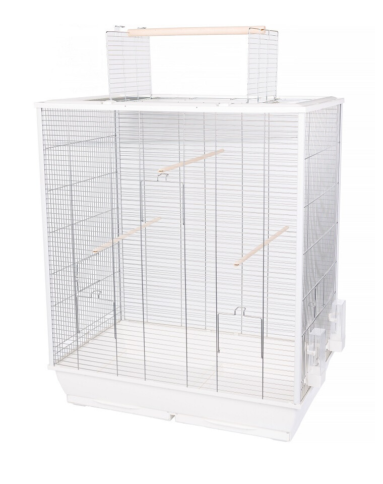 Een hoge en grote vogelkooi. Uitgerust met voederplaatsen en zitstokken, die de vogels de mogelijkheid geven om uit te rusten of te spelen, kunnen ze ook een plek bieden om vogel speelgoed of accessoires aan te brengen. De zitstokken zijn zo in de kooi geplaatst dat de vogels optimaal kunnen vliegen en tussen de staven heen en weer kunnen springen.