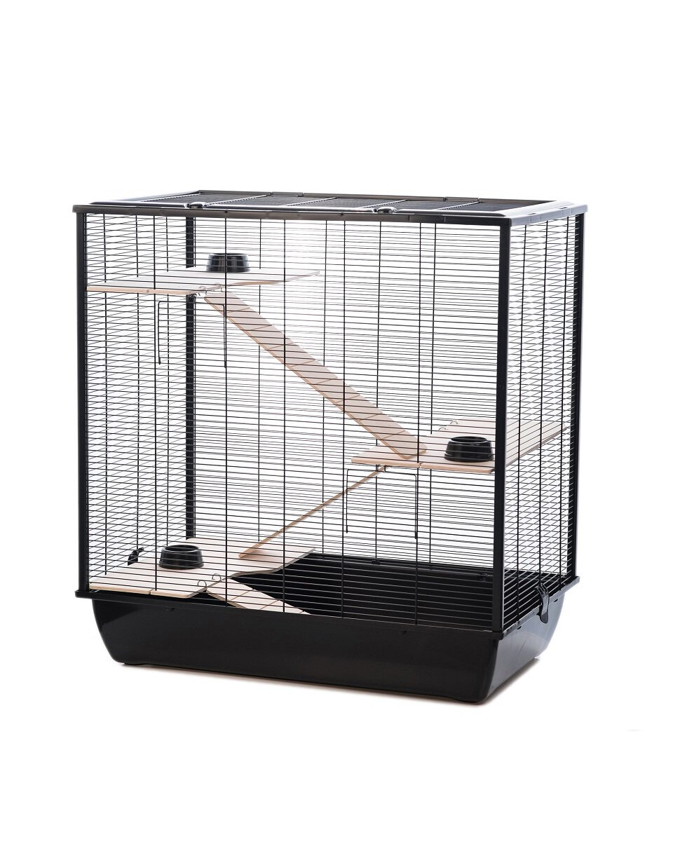 De kooi is stabiel en ruim. Het diepe kattenbakje voorkomt dat zaagsel of ander substraat in de kooi komt, en stelt het dier in staat om vrij te graven en te wroeten. De inrichting is van hout, de planken en ladders zijn zo ontworpen dat ze de knaagdieren een veilige doorgang bieden.