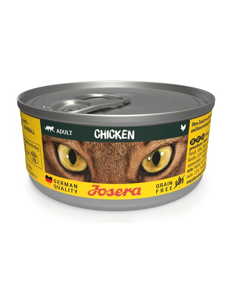 Mmm, tijd voor een heerlijke afwisseling! Ons nieuwe assortiment natvoer in blik voor katten biedt nog meer keuze en meer smaak in het voerbakje. Jouw kat zal genieten van het heerlijke Josera Chicken gerecht met malse kip. Het graanvrije recept is verrijkt met zalmolie, die essentiële omega-3 vetzuren levert én de smaak versterkt.