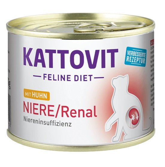 Ondersteuning van de nierfunctie bij chronisch nierfalen. NIERE/RENAL is speciaal ontwikkeld voor de voeding van katten met een eiwitarm dieet. Het gebruikte eiwit is van bijzonder hoge kwaliteit en gemakkelijk verteerbaar. Een hoog eiwitgehalte kan nadelige effecten op de nieren hebben; de verhouding van het eiwitgehalte ten opzichte van de energie-inhoud (calorieën) is bijzonder belangrijk. De verrijking met kaliumcitraat, dat een alkaliserend effect op de urine heeft, zorgt voor een minder zure (neutrale) urine en kan zo de vorming van nierstenen (oxalaatkristallisatie) voorkomen. Ook het fosforgehalte wordt verlaagd.
