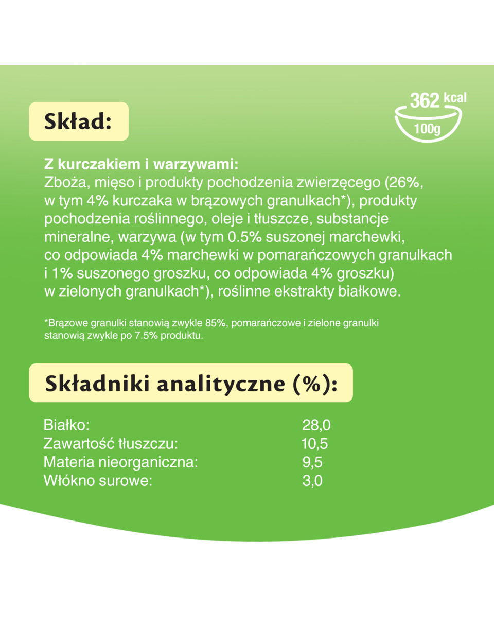 Granen, vlees en dierlijke bijproducten (waaronder 4% kippenvlees in bruin graan), plantaardige bijproducten, plantaardige eiwitextracten, oliën en vetten, mineralen, groenten (waaronder 4% erwten in groene spelt).