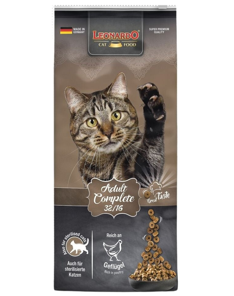 LEONARDO Adult Complete 32/16, de heerlijke smaakvariant uit het LEONARDO® Adult programma met een gematigd energiegehalte (16% vet) voor katten die een lagere activiteit hebben.