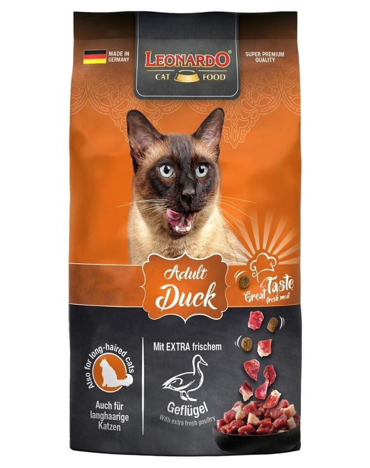 LEONARDO Adult Duck & Rice is een droogvoer voor volwassen katten met eend en rijst (vanaf het eerste levensjaar).